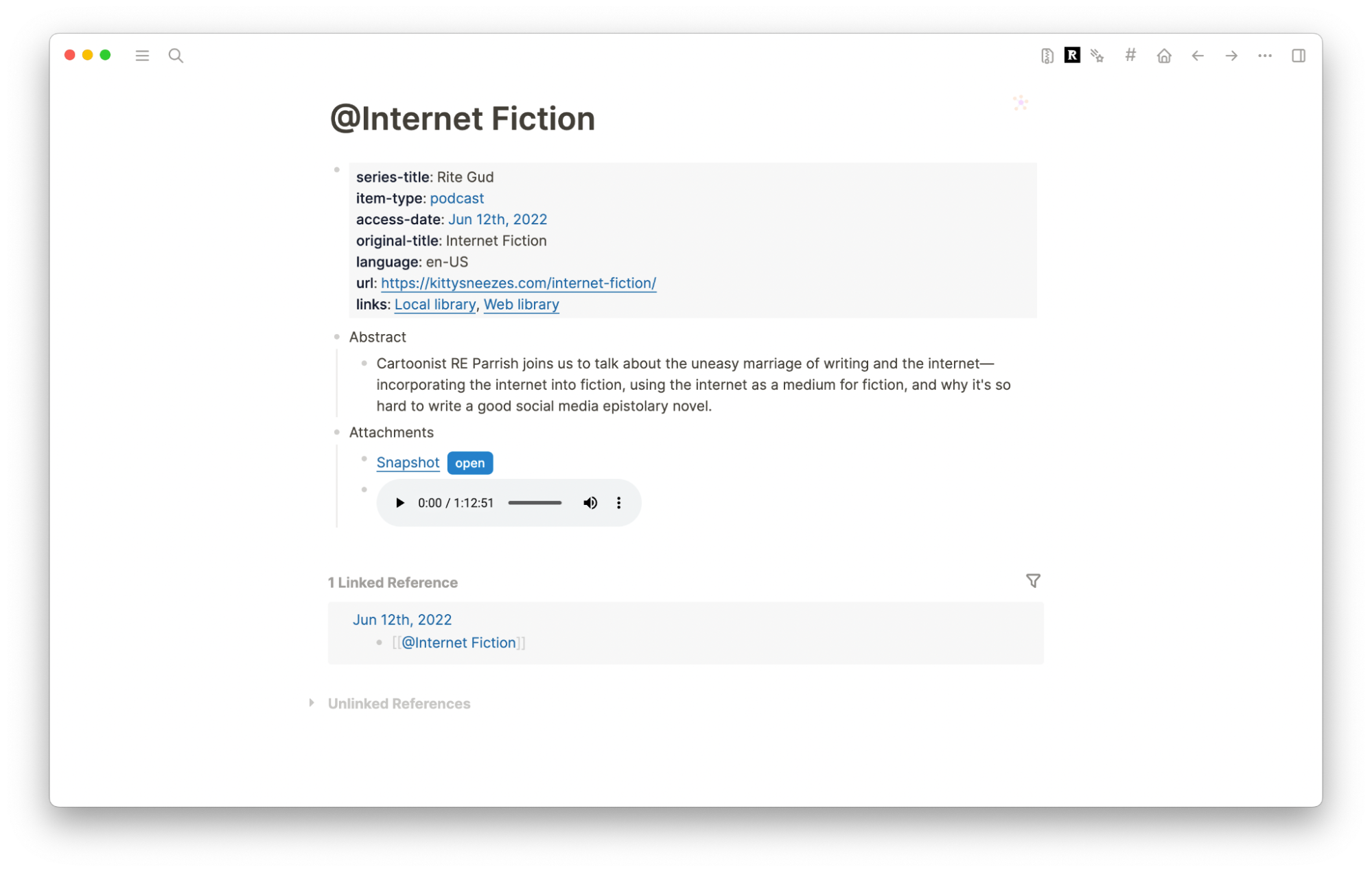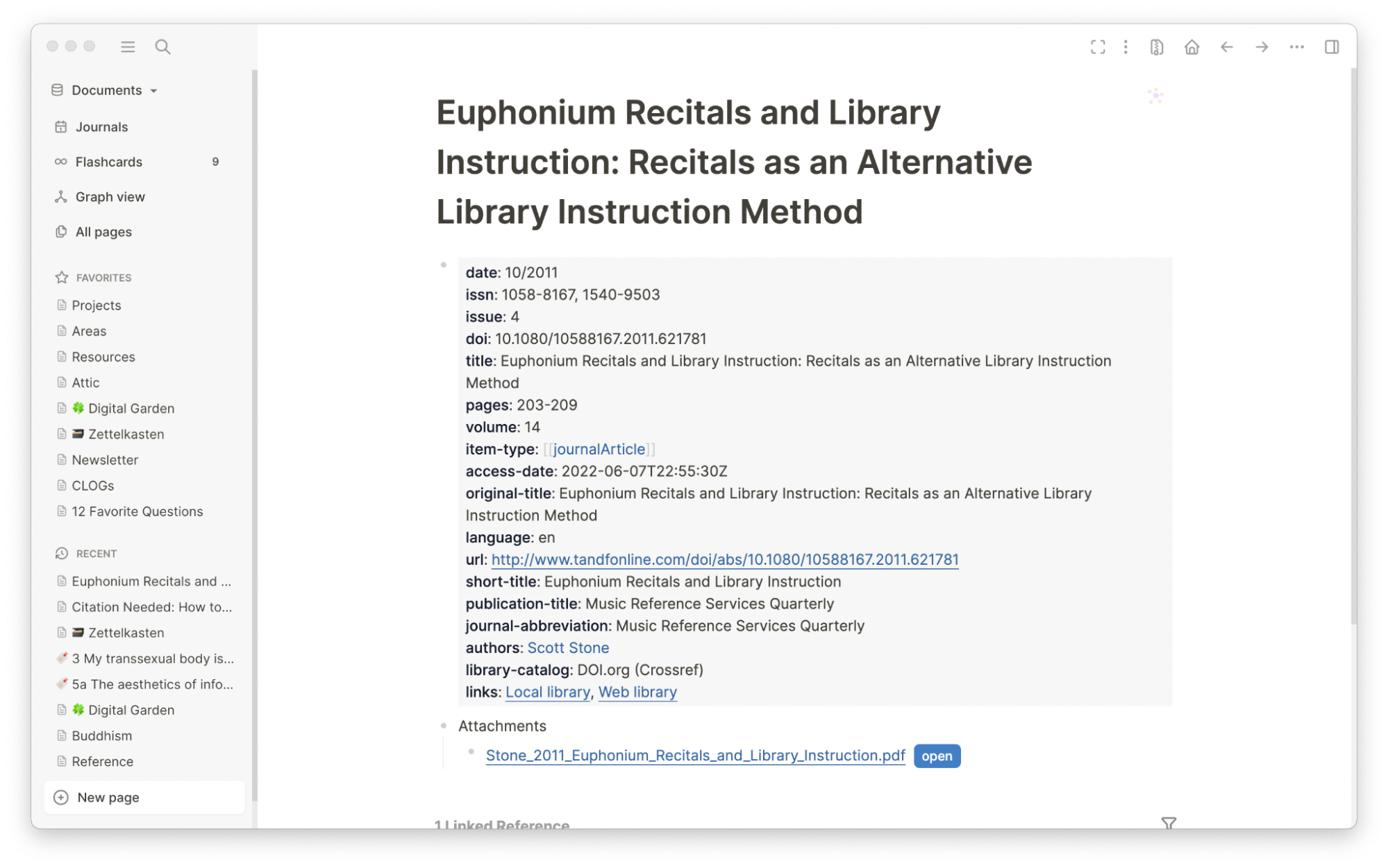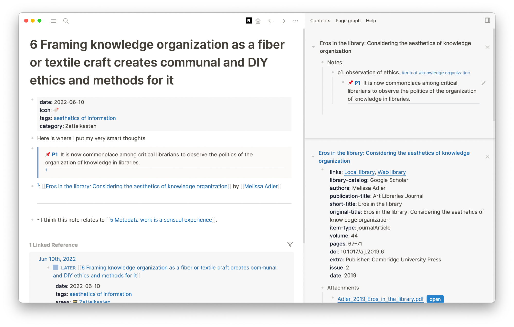I can go back to my reference note and check my page graph to see what other notes I’ve cited this article in. I can also see any tags associated with it.