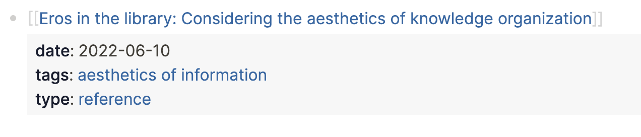 An interest of mine right now is the aesthetics of information. A while back, I added an article to my Zotero library related to this topic. I decide I’m going to read it, keeping in mind the topics I’m interested in. I open Logseq and use my Reference Note template[7] on my daily journal page (see below for the template code).