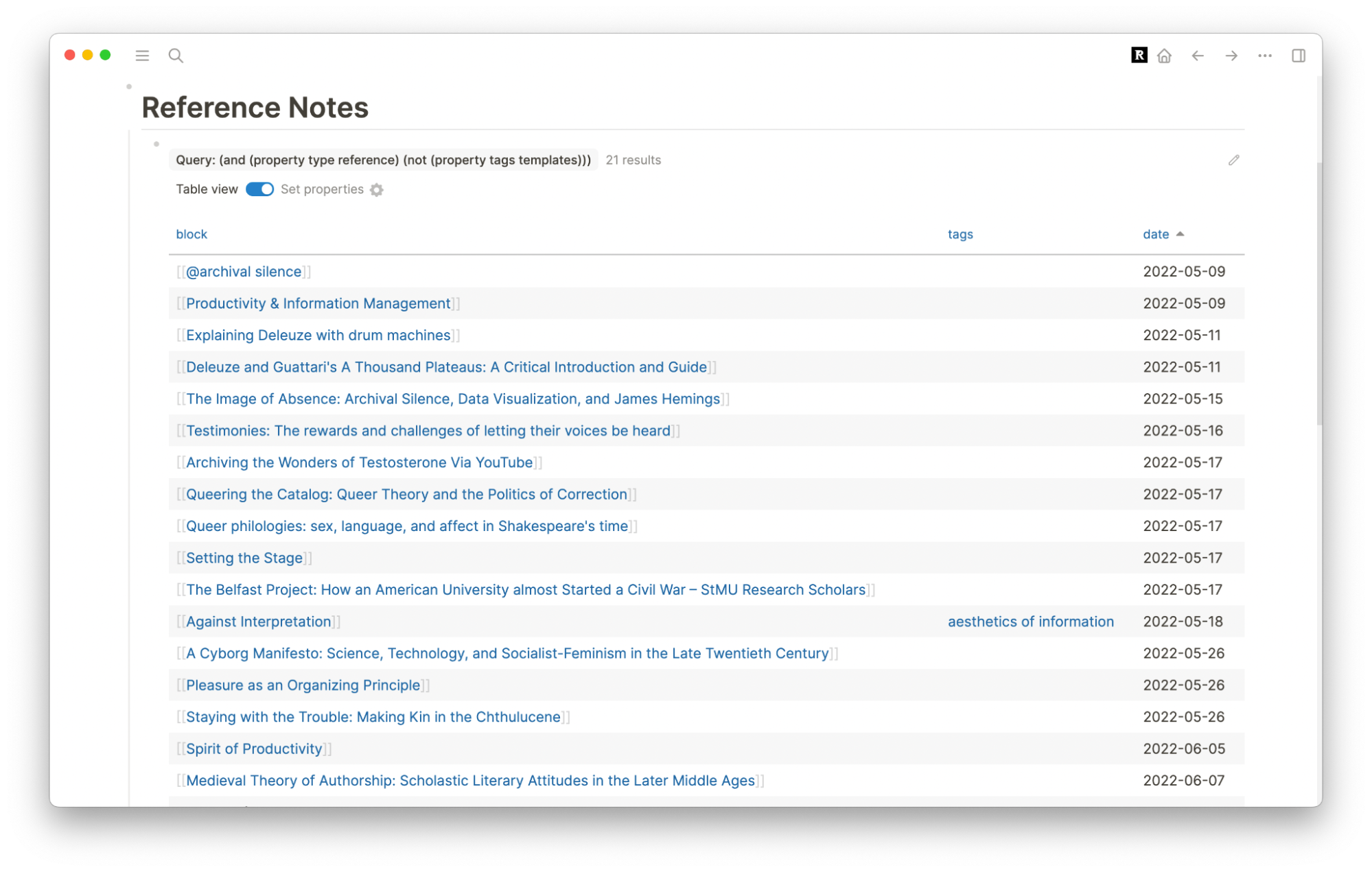 The tags and type properties are self-explanatory, but I use the date property a bit strangely. I add today’s date in YYYY-MM-DD format instead of using the date picker. I only use this information to sort a queried table of my reference notes by the date I added them. The query is {{query (and (property type reference) (not property tags templates))}} because I don’t want my reference note template in my query results.