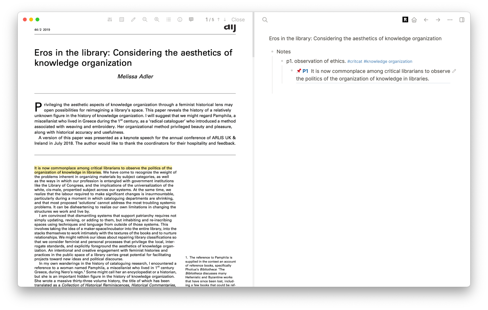 Now, as I showed earlier, I can open the page and the associated PDF to start reading, annotating, and indexing. I’m still working out which workflow for highlights I like best. I encourage you to have fun experimenting with workflows! Remember that you can edit the block reference highlight text, either to correct what it pulled or to make your own notes. Either way, it will always return you back to that highlight in your PDF.