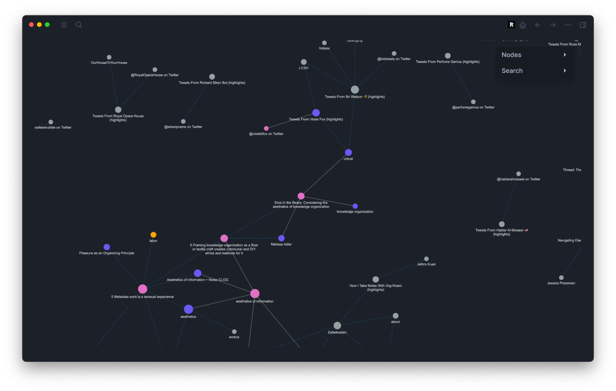 In my main graph, I’ll eventually be able to see larger nodes of references I’ve cited a lot and everything I’ve cited them in. I can also see which authors I cite.