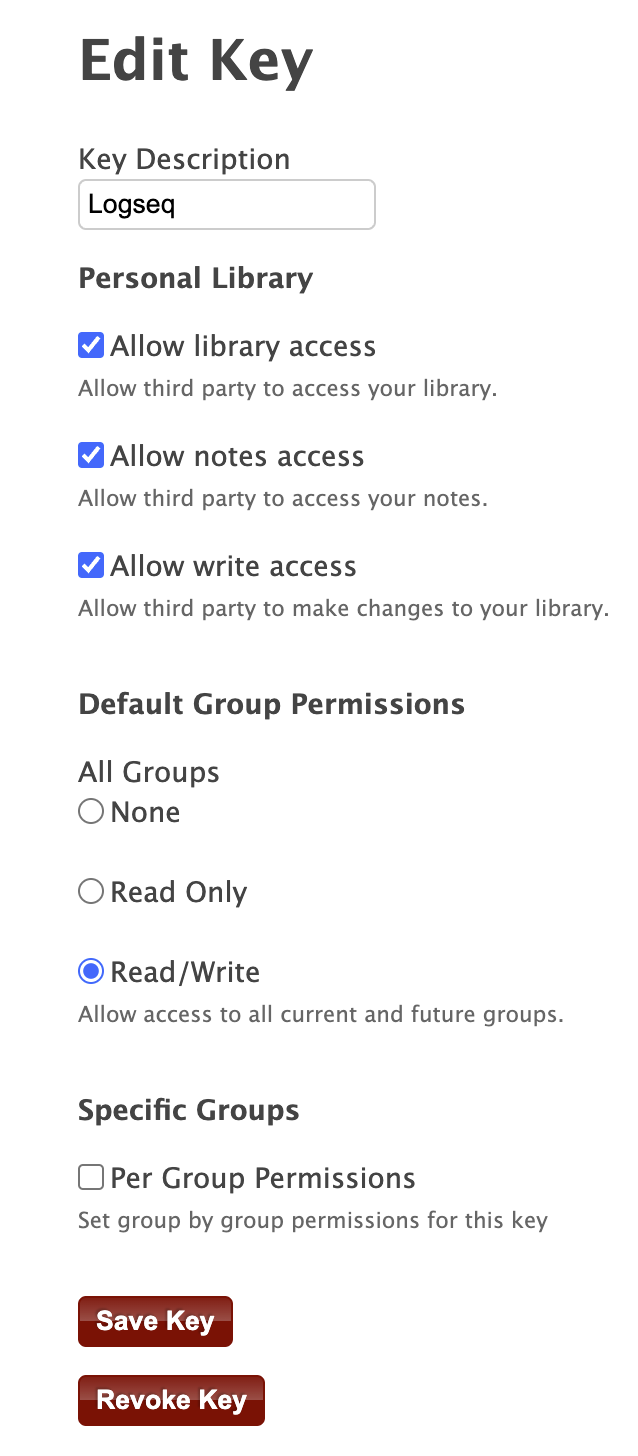 Click "Create new private key" and name or describe your key. For the "Personal Library" access settings, you must at least have "Allow library access" checked. I recommend also checking "Allow notes access" if you want to give Logseq access to your notes in Zotero. It can’t right now, but it should in the future. Otherwise, configure your access settings however you like.
