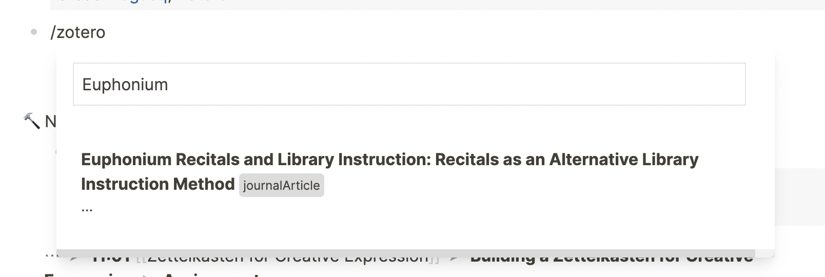 When I know I'm going to cite something or read it to take notes, I open Zotero and type /Zotero in my Logseq daily journal page. A search bar pops up. Because I know what I'm going to cite, I type the author or something from the title to bring up the reference. I click on the reference I want, and it creates a page!