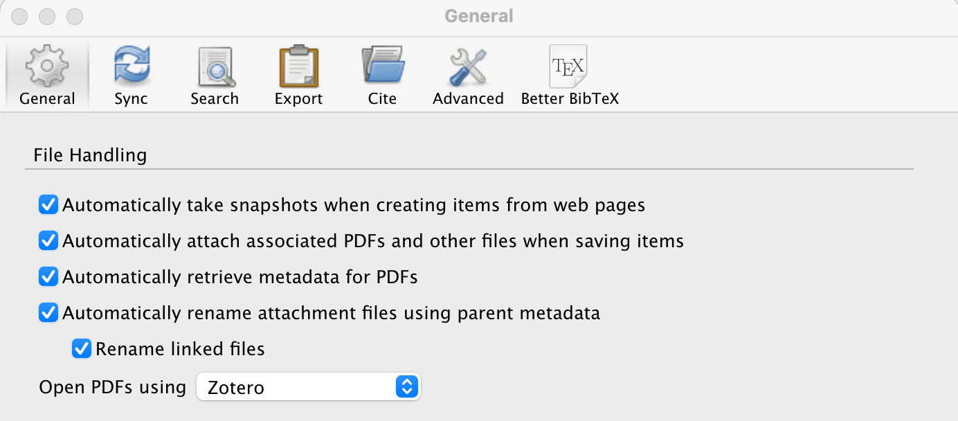 Download Zotero, install it, and go to Preferences. If you want Logseq to bring in your PDF files, I recommend setting Zotero up to automatically grab them when you clip articles in your browser. You can also drag and drop PDFs into Zotero, either on their own or onto an existing reference. If they are modern PDFs, Zotero should be able to grab the bibliographic information for them automatically. If not, you will need to create a reference manually (or clip it from somewhere) and drag the PDF onto the new reference.