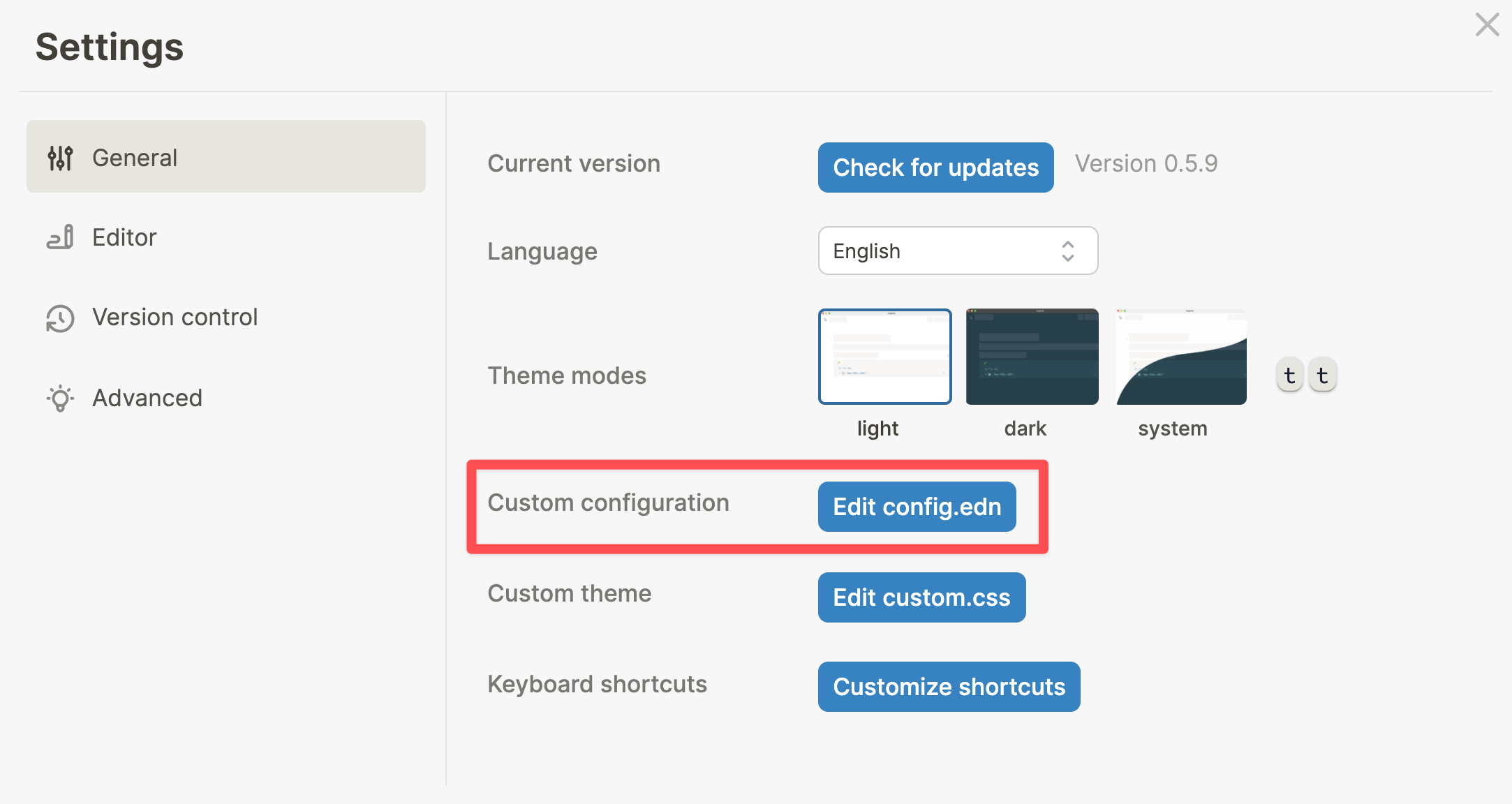 F in front of the name indicates it's a fileAnother way to open the config.edn file is by opening the settings screen and clicking the Edit config.edn button from the General tab:
