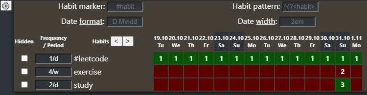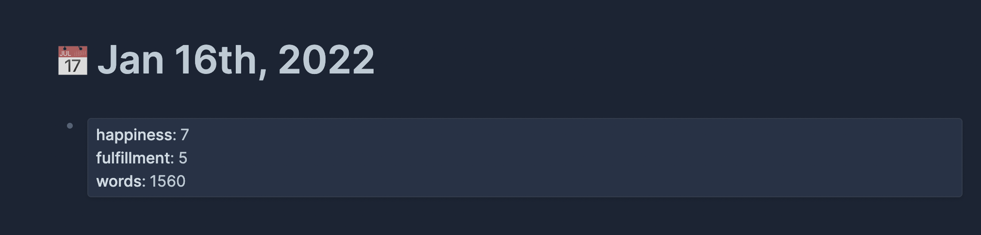 Using a few hashtags on your Journals page, you can easily visualize how well you've kept to habits that you set for yourself. Simply add the tags and the habit you want to track to your daily Journal, and use the plugin to see how you're doing.