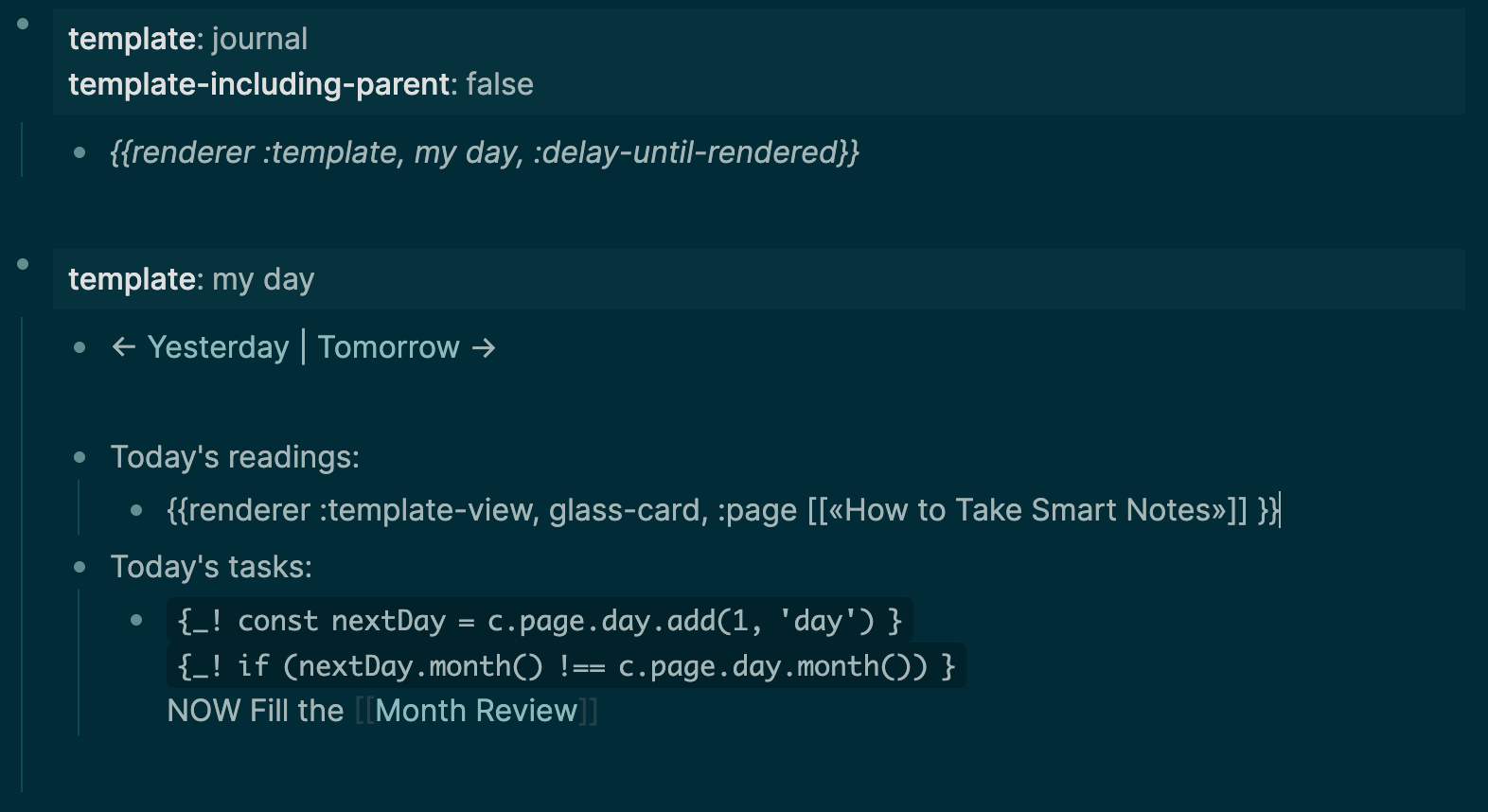 If you need to use more complex logic for your Daily Journal templates, you can use the Full House Templates plugin. This plugin allows you to involve the JavaScript environment and any Logseq context information to create a template that suits your needs. For example, you can add a navigation header to switch between days, include a monthly review task (but only on the last day of the month), or enhance your journal with stylish views of what you're currently reading.